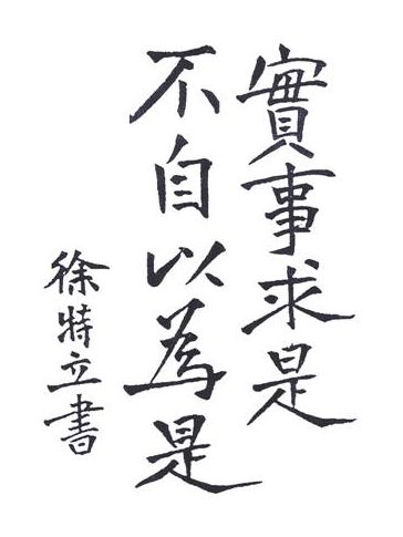 “實事求是,不自以為是”是老院長徐特立的思想。1942年4月1日,徐特立在擔任我校前身——自然科學院院長期間,組織開展了為期9個月的教育方針大討論,并在《解放日報》上發(fā)表了《再論我們怎樣學習》一文,提出了“實事求是”,不要“自以為是”的思想。1949年10月,徐特立為《河北教育》創(chuàng)刊號題寫了“實事求是,不自以為是”九個字,并說明這是學風中最重要的。