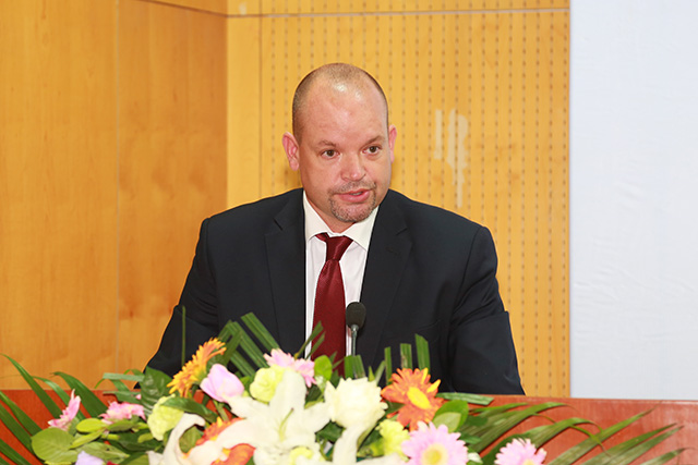副校長(zhǎng)趙顯利教授在典禮上致辭。趙校長(zhǎng)首先代表北京理工大學(xué)向全體畢業(yè)生和新生表示衷心的祝賀和熱烈的歡迎,并對(duì)戴姆勒公司的支持與各位老師的辛勤工作表示感謝。趙校長(zhǎng)用“知行合一”思想鼓勵(lì)學(xué)員們?cè)鰪?qiáng)道德意識(shí)的自覺性與實(shí)踐性,追求真理、勇于實(shí)踐。