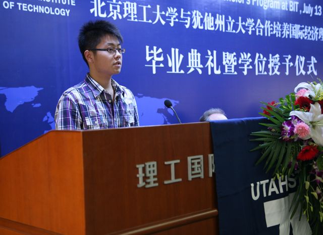 李璐同學(xué)代表全體畢業(yè)生發(fā)言,她用充滿激情的語(yǔ)言對(duì)北京理工大學(xué)和猶他州立大學(xué)的悉心培養(yǎng)表達(dá)了感謝和感恩之情。