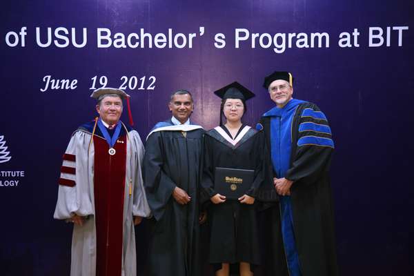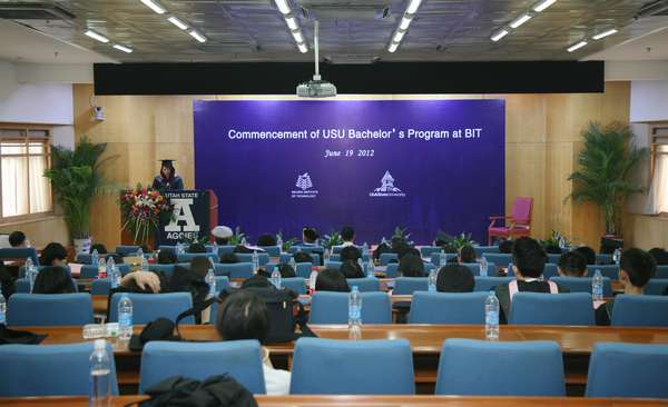 2012年6月19日下午,國(guó)際教育合作學(xué)院在理工國(guó)際教育交流大廈報(bào)告廳隆重舉行北京理工大學(xué)與猶他州立大學(xué)合作辦學(xué)項(xiàng)目第六屆學(xué)生畢業(yè)典禮,出席畢業(yè)典禮的有北京理工大學(xué)副校長(zhǎng)孫逢春教授、猶他州立大學(xué)商學(xué)院助理院長(zhǎng)Dave Patella教授、語(yǔ)言系主任Brad Hall教授、中國(guó)項(xiàng)目主任Dwight Israelsen教授、副主任賴超群博士、國(guó)際教育合作學(xué)院院長(zhǎng)梅文博教授、校國(guó)際交流合作處對(duì)外交流科科長(zhǎng)劉艷紅副教授、學(xué)院部分教職工、全體畢業(yè)生及部分學(xué)生家長(zhǎng)。典禮由梅文博院長(zhǎng)主持。