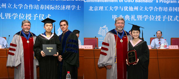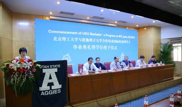 2013年6月20日下午,國際教育合作學院在理工國際教育交流大廈報告廳隆重舉行了北京理工大學與猶他州立大學合作辦學項目第七屆學生畢業(yè)典禮。出席畢業(yè)典禮的有猶他州立大學Jon Hunstman商學院副院長Frank Caliendo博士、中國項目主任Dwight Israelsen博士,北京理工大學國際交流合作處處長王慶林教授、國際教育合作學院院長梅文博教授、羅佳書記、明道福副院長、蔣志湘副院長、學院部分教職工、全體畢業(yè)生、部分學生家長以及猶他州立大學來京訪學的學生代表團。典禮由蔣志湘副院長主持。