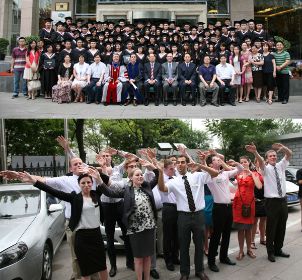 典禮儀式結束后,領導、嘉賓與全體畢業(yè)生合影留念。來訪的猶他州立大學十六名學生帶領畢業(yè)生們唱起了猶他州立大學校歌,祝賀同學們成為猶他州立大學的畢業(yè)生,現(xiàn)場氣氛隆重而熱烈。