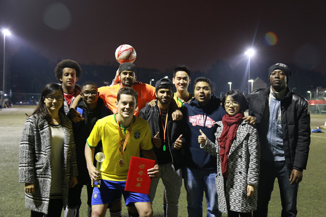 比賽采取集中賽會制,分兩個階段進行。第一階段以抽簽方式分組并進行單循環(huán)比賽;第二階段采用淘汰賽的方法決出此次比賽的冠軍。經(jīng)過兩個周末3天25場比賽的激烈角逐,我校巴西學(xué)生李丹烈和費希文領(lǐng)銜的隊伍頑強拼搏,過關(guān)斬將,最終獲得了冠軍。此外,還決出了最佳射手1人、最佳守門員1人。留學(xué)生中心為獲獎隊伍和個人頒發(fā)了獎杯及榮譽證書。