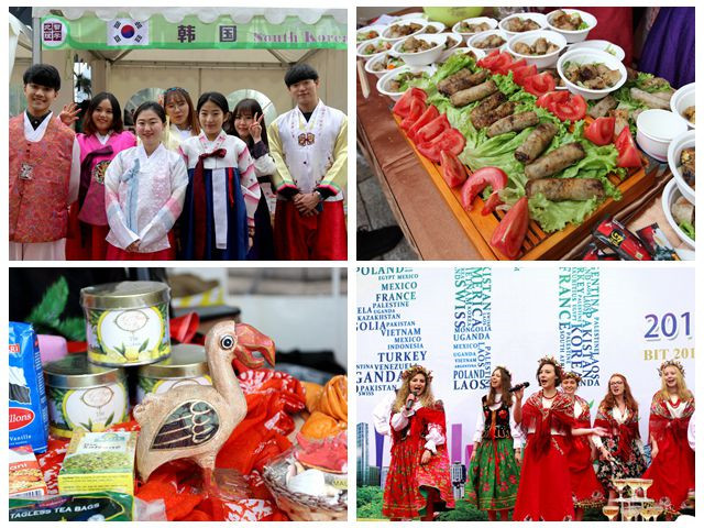 在舞臺(tái)區(qū),各國(guó)準(zhǔn)備的文藝表演贏得觀眾滿場(chǎng)喝彩:中國(guó)功夫氣勢(shì)恢宏;金發(fā)碧眼的俄羅斯、波蘭姑娘們?yōu)槲覀冄堇[了一場(chǎng)溫婉動(dòng)人的江南傘舞;南非的學(xué)生帶來(lái)了熱情奔放的舞蹈,讓觀眾們一下子夢(mèng)回非洲;我們還有來(lái)自尼日利亞、哈薩克斯坦、巴拿馬等國(guó)家的留學(xué)生組成的BIT International合唱團(tuán),動(dòng)聽的演唱讓觀眾如癡如醉。拍照區(qū)一個(gè)個(gè)生動(dòng)立體的卡通形象吸引了大小觀眾紛紛前來(lái)合影留念。不同國(guó)度、不同民族的國(guó)際文化元素在這里精彩綻放、交融升華!