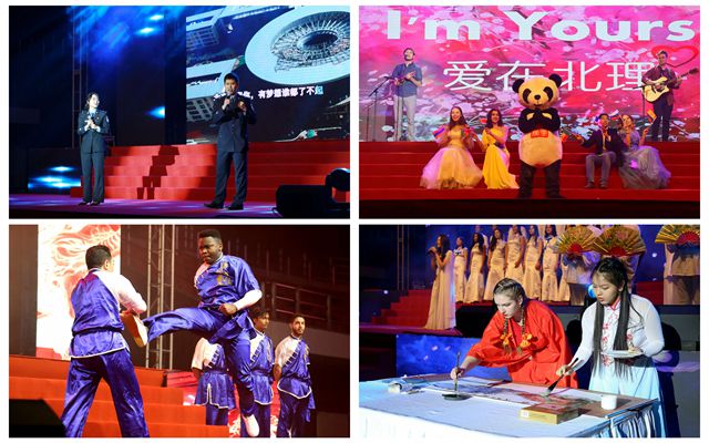 本次大會以“五洲之風(fēng) 炫亮北理”為主題,由“春耕、夏鋤、秋收、冬藏”四個篇章組成,體現(xiàn)了來自五洲四海的同學(xué)們滿懷希冀、在“留學(xué)北理”這片熱土上撒下了夢想種子的美好憧憬。柔美靈動兼具的古風(fēng)舞蹈《小雅采薇》,唯美的舞姿、濃濃的古韻令現(xiàn)場觀眾沉醉其中;由房山公安分局出入境管理大隊警官帶來的一首《北京歡迎你》,向外國留學(xué)生展示了北京開放包容的姿態(tài)和房山山明水秀的景色;歌伴舞《I’m yours》演繹了一段我校外國留學(xué)生的樸實校園生活,展示出國際學(xué)子的蓬勃朝氣和校園生活的五彩繽紛;由留學(xué)生中心老師和外國留學(xué)生共同演繹的現(xiàn)代舞《花兒為什么這樣紅》動感十足,舞姿妙曼、衣袂飄飄,呈現(xiàn)出別樣的異域風(fēng)情;文化體驗課展示節(jié)目《華夏國風(fēng)》融入了中國功夫、中文歌曲大合唱、現(xiàn)場揮毫中國畫等內(nèi)容,多角度展現(xiàn)了我校外國留學(xué)生對中華傳統(tǒng)文化的深刻認識;孔子學(xué)院獎學(xué)金生帶來的精彩配音表演,展示出其扎實的中文功底,贏得現(xiàn)場觀眾的陣陣喝彩;大會經(jīng)典保留節(jié)目《北理寶萊塢》今年迎來了第三季,動感的音律、優(yōu)美的舞姿、青春的活力,將演出推向了最高潮;旗袍秀《禮儀中國》將華夏禮儀之邦的氣韻和風(fēng)度展示的淋漓盡致。整場演出場面壯麗、美輪美奐,彰顯出當代北理外國留學(xué)生拼搏向上的精神風(fēng)貌和卓爾不群的風(fēng)采才華。
