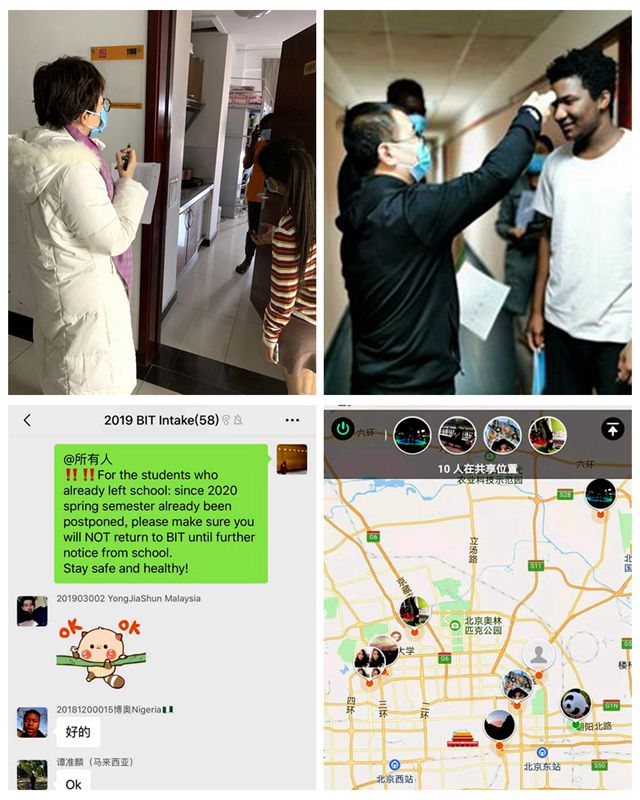 及時宣傳引導。針對留學生群體的特殊性,學校著力做好宣傳引導工作。留學生中心通過微信公眾號、學生通知群等網絡渠道,向學生及時發(fā)布官方通知信息和安全防護提示,宣傳普及疫情防治知識和防控要求,強化健康教育、提高防范意識?!傲魧W北理”微信公眾號累計發(fā)布(含轉載)近20條、精心翻譯重要通知消息10余條,向學生微信群發(fā)布通知100余次。中心還撰寫發(fā)布《致北理工全體國際學子的一封信》,溫馨提示全體留學生服從學校安排、科學做好防護、確保健康平安,制作了通知延期開學的電子調查問卷及時收集學生反饋,確保每一名在籍留學生知曉延期開學并承諾不提前返校,回收率達100%。