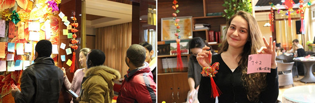 On that day, many students came to the lounge very early to help the teachers hang lanterns, paste Chinese paper-cutting and couplets, and decorate the lounge according to the Chinese Spring Festival customs. This event was divided into four parts including paper cutting, lantern riddles guessing, Chinese calligraphy writing, and dumplings making. Students from Pakistan, Rwanda, Germany, America and many other countries all participated in these activities.