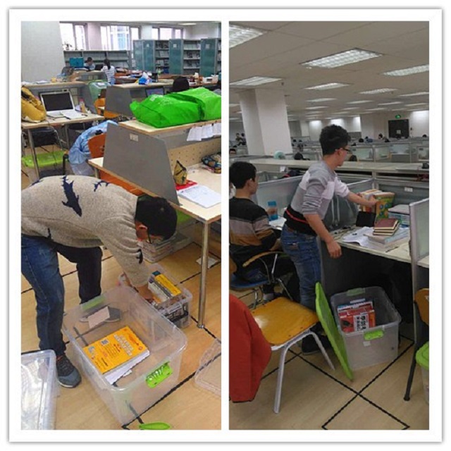 為了解決這一問題,圖書館當(dāng)即提出解決方案:將圖書館三、四層設(shè)為考研復(fù)習(xí)專區(qū),并采購500個(gè)收納箱借給考研學(xué)生使用,要求同學(xué)們將書本等物品收納在箱內(nèi),人走時(shí)將收納箱放在椅子下或桌子底下,起到“人走桌空,杜絕占座”的作用。11月的兩個(gè)周末讀者服務(wù)部工作人員加班加點(diǎn),把500個(gè)收納箱發(fā)到考研學(xué)生手中。