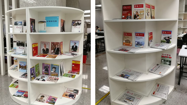 “十九大”時事新聞展。黨的“十九大”是具有里程碑意義的重要會議,圖書館在一層休閑區(qū)開展“時事新聞展”,展出與“十九大”相關(guān)的報刊雜志,隨時更新,方便讀者及時了解會議熱點,學習會議內(nèi)容,領(lǐng)悟會議精神,用習近平新時代中國特色社會主義思想武裝頭腦、指導實踐,樹立正確的理想信念,以高尚的道德情操修身養(yǎng)德,完善自身修養(yǎng)。