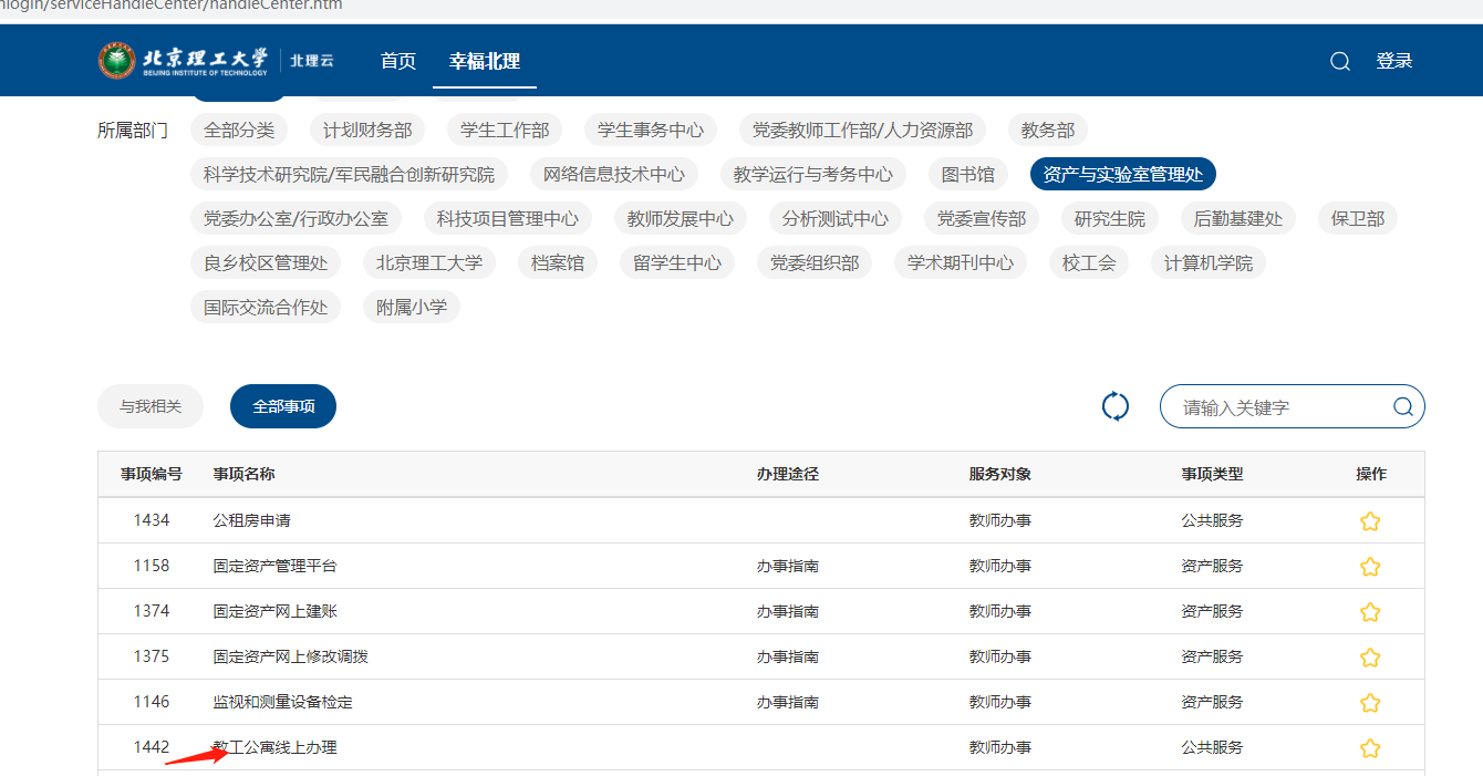 登錄校園網(wǎng)“幸福北理”,通過“教工公寓系統(tǒng)線上辦理”填寫博士后公寓租住申請表,資產(chǎn)與實驗室管理處和黨委教師工作部/人力資源部進行資格審查。