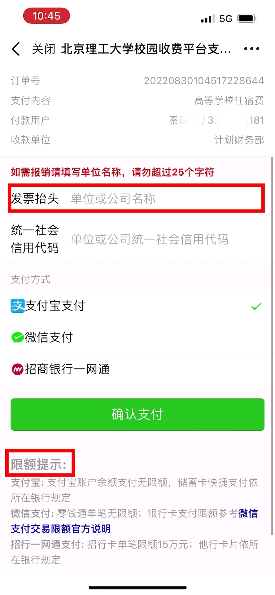 學(xué)生繳費(fèi)開具的票據(jù)“交款人”是學(xué)生本人姓名。如需在姓名后增加單位、公司名稱的,請(qǐng)?jiān)谥Ц队唵沃邪l(fā)票抬頭處填寫名稱。