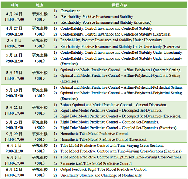 為對標(biāo)國際頂尖高校,加快“雙一流”建設(shè)步伐,北京理工大學(xué)自動化學(xué)院特邀控制科學(xué)與工程領(lǐng)域知名專家Sa?a V. Rakovi?教授于4月24日至6月12日期間在北京理工大學(xué)開設(shè)前沿控制理論公開課。該課程為我校第二期來華留學(xué)英文授課品牌課程《隨機過程理論及應(yīng)用》的選修模塊,課程內(nèi)容涵蓋模型預(yù)測控制,魯棒模型預(yù)測控制等前沿控制理論。課程主要面向研究生和高年級本科生,歡迎感興趣的同學(xué)參加。具體開課時間、地點和課程內(nèi)容安排如下:
