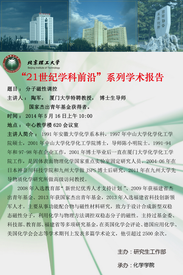 化學(xué)學(xué)院“21世紀(jì)學(xué)科前沿”陶軍教授學(xué)術(shù)報(bào)告預(yù)告