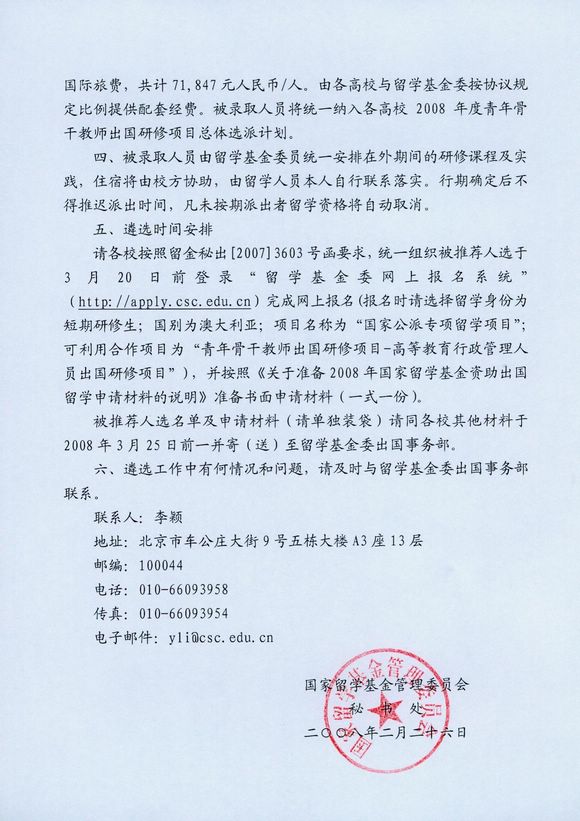 現(xiàn)將國(guó)家留學(xué)基金委《關(guān)于遴選“高等教育行政管理人員出國(guó)研修項(xiàng)目”留學(xué)候選人的函》轉(zhuǎn)發(fā)給你們,請(qǐng)結(jié)合本單位實(shí)際,認(rèn)真組織申報(bào)工作。申報(bào)人員請(qǐng)?zhí)顚?xiě)《北京理工大學(xué)行政管理人員出國(guó)研修申報(bào)表》,并附相關(guān)證明材料復(fù)印件,于2008年3月6日前送交黨委組織部。