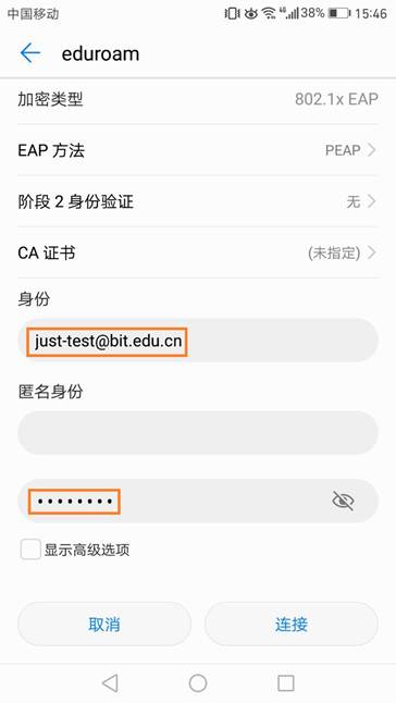 2、安卓系統(tǒng)在認(rèn)證頁面中輸入“身份”和“密碼”?!吧矸荨笔潜救嗽谛I暇W(wǎng)賬號加學(xué)校域名后綴,如just-test@www.gdhylsjc.com,“密碼”是對應(yīng)賬號的上網(wǎng)密碼。其他地方均無需配置,如圖2所示。