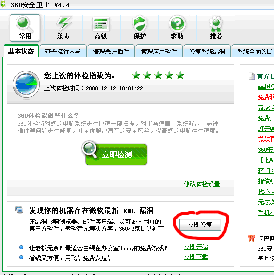修復步驟2:如發(fā)現界面有漏洞提示,請點擊【立即修復】(見下圖)。