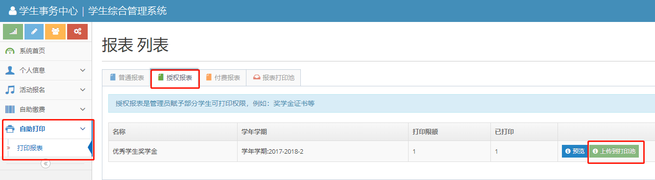 第一步: 需自助打印證書學生請在http://ssc.info.www.gdhylsjc.com/單點登錄,進入如下界面,點擊自助打印——打印報表——選擇要打印的獎項上傳到打印池;