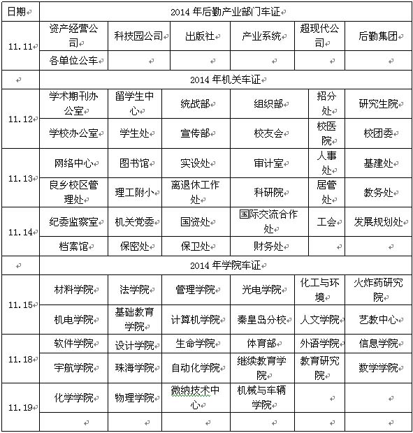 3. 自11月11日起,各單位到停車公司(菜市場北門對面)進行交費并領(lǐng)取2014年停車證。各單位領(lǐng)取車證時間安排如下: