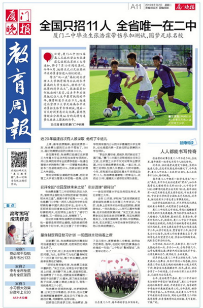 日前,廈門二中2019屆高三足球班畢業(yè)生張浩霖已收到北京理工大學(xué)通知,將于7月10日到校集訓(xùn)。今年9月,他將正式以足球高水平運(yùn)動(dòng)員身份進(jìn)入該校就讀。