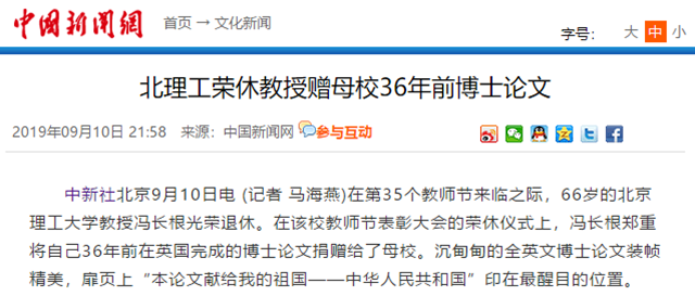 在第35個(gè)教師節(jié)來臨之際,66歲的北京理工大學(xué)教授馮長根光榮退休。在該校教師節(jié)表彰大會(huì)的榮休儀式上,馮長根鄭重將自己36年前在英國完成的博士論文捐贈(zèng)給了母校。沉甸甸的全英文博士論文裝幀精美,扉頁上“本論文獻(xiàn)給我的祖國——中華人民共和國”印在最醒目的位置。