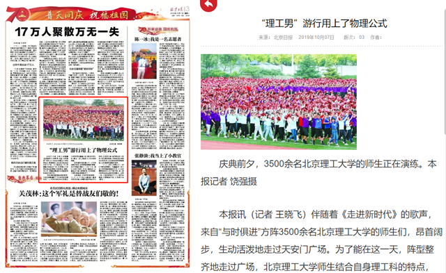 伴隨著《走進(jìn)新時(shí)代》的歌聲,來(lái)自“與時(shí)俱進(jìn)”方陣3500余名北京理工大學(xué)的師生們,昂首闊步,生動(dòng)活潑地走過(guò)天安門廣場(chǎng)。為了能在這一天,陣型整齊地走過(guò)廣場(chǎng),北京理工大學(xué)師生結(jié)合自身理工科的特點(diǎn),畫圖、列公式,測(cè)算出最佳的行進(jìn)速度和科學(xué)的行進(jìn)方式。