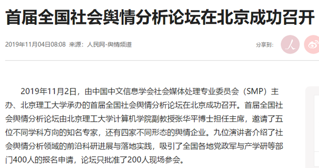 2019年11月2日,由中國中文信息學(xué)會(huì)社會(huì)媒體處理專業(yè)委員會(huì)(SMP)主辦、北京理工大學(xué)承辦的首屆全國社會(huì)輿情分析論壇在北京成功召開。首屆全國社會(huì)輿情分析論壇由北京理工大學(xué)計(jì)算機(jī)學(xué)院副教授張華平博士擔(dān)任主席,邀請(qǐng)了五位不同學(xué)科方向的知名專家,還有四家不同形態(tài)的輿情企業(yè)。九位演講者介紹了社會(huì)輿情分析領(lǐng)域的前沿科研進(jìn)展與落地實(shí)踐,吸引了全國各地黨政軍與產(chǎn)學(xué)研等部門400人的報(bào)名申請(qǐng),論壇只批準(zhǔn)了200人現(xiàn)場參會(huì)。