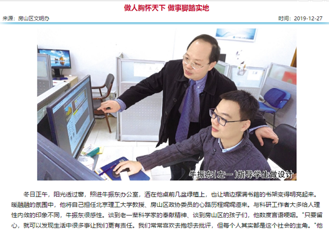 "每個(gè)人的能力有限,所以我提倡做有用的東西,做國(guó)家、社會(huì)需要的東西。"牛振東的想法很"接地氣",因?yàn)樗回灡帜_踏實(shí)地的原則。這種做事風(fēng)格也體現(xiàn)在他履職過(guò)程中。"委員參政議政是有要求的,我們要怎樣去調(diào)查,怎樣去協(xié)商,才能不浪費(fèi)這個(gè)權(quán)利?我希望在學(xué)術(shù)研究上做的東西有用,議政也要議到點(diǎn)子上。我考慮的就是房山切實(shí)的需要,尤其涉及教育的事情。"他說(shuō)。 自 2016 年任房山區(qū)政協(xié)委員以來(lái),牛振東認(rèn)真履行委員職責(zé),積極參政議政,參與撰寫了《利用信息化技術(shù)推動(dòng)傳統(tǒng)村落保護(hù)方案建議》《構(gòu)建基于互聯(lián)網(wǎng)的房山文化旅游數(shù)據(jù)融合及服務(wù)》等多份調(diào)查建議報(bào)告,作為主筆人連續(xù)三年提交 3 份政協(xié)提案。