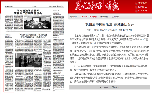 1月11日,“北京市影視娛樂(lè)法學(xué)會(huì)2019年會(huì)暨第四屆中國(guó)娛樂(lè)法高端論壇”在北京理工大學(xué)召開(kāi)。會(huì)議發(fā)布了北京市影視娛樂(lè)法學(xué)會(huì)2019年度工作報(bào)告,同時(shí)發(fā)布“2019十大中國(guó)文化娛樂(lè)法治事件”。