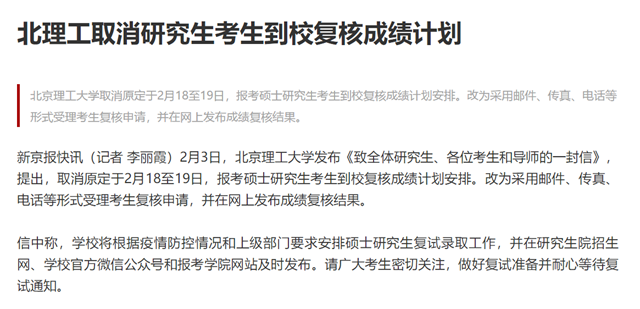 2月3日,北京理工大學(xué)發(fā)布《致全體研究生、各位考生和導(dǎo)師的一封信》,提出,取消原定于2月18至19日,報(bào)考碩士研究生考生到校復(fù)核成績(jī)計(jì)劃安排。改為采用郵件、傳真、電話等形式受理考生復(fù)核申請(qǐng),并在網(wǎng)上發(fā)布成績(jī)復(fù)核結(jié)果。