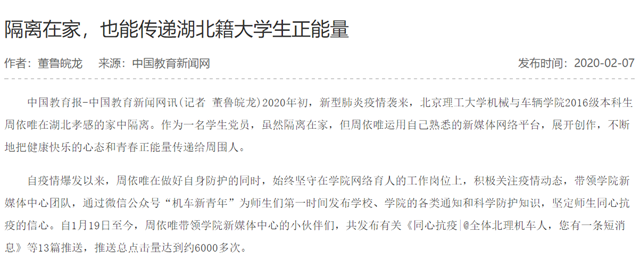 編輯:吳楠 審核:王征 閱讀次數(shù):原文標(biāo)題:隔離在家,也能傳遞湖北籍大學(xué)生正能量
