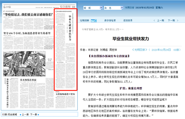 繼國(guó)務(wù)院常務(wù)會(huì)議提出,當(dāng)前要更加注重穩(wěn)就業(yè)特別是高校畢業(yè)生、農(nóng)民工等重點(diǎn)群體就業(yè)后,教育部副部長(zhǎng)翁鐵慧、人力資源和社會(huì)保障部副部長(zhǎng)游鈞在2月28日舉行的國(guó)務(wù)院聯(lián)防聯(lián)控機(jī)制新聞發(fā)布會(huì)上介紹了相關(guān)政策的具體情況。翁鐵慧在會(huì)上表示,碩士研究生招生的規(guī)模比去年可能會(huì)增加18.9萬人,同時(shí)擴(kuò)大普通高校專升本的規(guī)模,同比爭(zhēng)取增加32.2萬人。