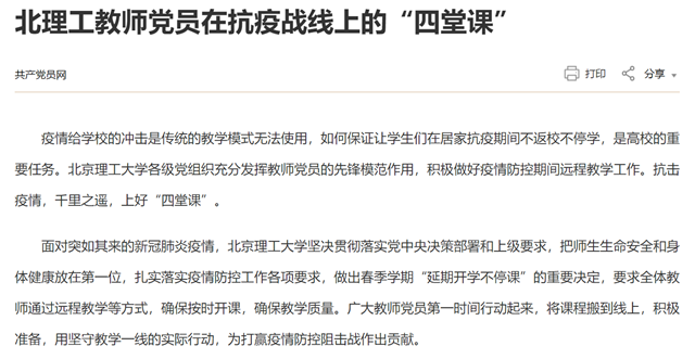 疫情給學校的沖擊是傳統(tǒng)的教學模式無法使用,如何保證讓學生們在居家抗疫期間不返校不停學,是高校的重要任務。北京理工大學各級黨組織充分發(fā)揮教師黨員的先鋒模范作用,積極做好疫情防控期間遠程教學工作??箵粢咔?,千里之遙,上好“四堂課”。