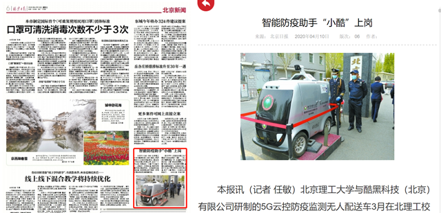 北京理工大學(xué)與酷黑科技(北京)有限公司研制的5G云控防疫監(jiān)測無人配送車3月在北理工校園上崗,運行一個月以來,效果良好?!靶】帷辈粌H能對一人或者多人秒測體溫,同時可報警并獨立配送物資。它還能移動監(jiān)測體溫,發(fā)現(xiàn)異常實時“喊話”,可用于復(fù)學(xué)后的校園疫情防控。