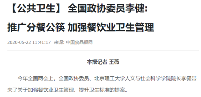 李健委員:推廣分餐公筷 加強(qiáng)餐飲業(yè)衛(wèi)生管理