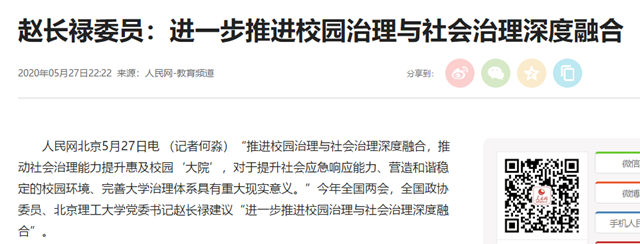 “推進(jìn)校園治理與社會治理深度融合,推動社會治理能力提升惠及校園‘大院’,對于提升社會應(yīng)急響應(yīng)能力、營造和諧穩(wěn)定的校園環(huán)境、完善大學(xué)治理體系具有重大現(xiàn)實(shí)意義?!苯衲耆珖鴥蓵?,全國政協(xié)委員、北京理工大學(xué)黨委書記趙長祿建議“進(jìn)一步推進(jìn)校園治理與社會治理深度融合”。