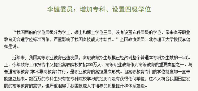 編輯:吳楠 審核:劉曉俏 閱讀次數(shù):原文標(biāo)題:李健委員:增加???、設(shè)置四級學(xué)位