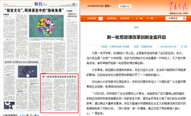 “6月23日,學(xué)校組織了社會(huì)觀察線上分享會(huì),包括參加了武漢雷神山醫(yī)院建設(shè)的鐘正統(tǒng)同學(xué)和其他身居抗疫一線的學(xué)生代表,面向全校師生分享了他們的社會(huì)觀察思考。通過(guò)身邊大量鮮活事例,學(xué)生們普遍對(duì)中國(guó)特色社會(huì)主義的制度優(yōu)勢(shì)及西方的制度缺陷有了切膚認(rèn)知,‘四個(gè)自信’進(jìn)一步增強(qiáng),真正實(shí)現(xiàn)了思政教育入腦入心?!敝軋?jiān)說(shuō)。