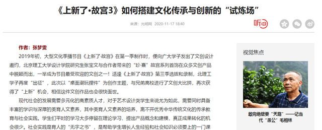 《上新了·故宮》這樣的節(jié)目,凸顯了社會實踐育人與高校人才培養(yǎng)的融合,節(jié)目所提供的廣闊舞臺和資源支撐,讓學生將理論知識轉(zhuǎn)化為實際應用,不但讓學生個人設計水平得到了充足試煉,更是推動了廣大學生參與設計實踐的熱情,是個非常有利于學生成長成才的創(chuàng)意嘗試,為學生走向社會架起一座橋梁。