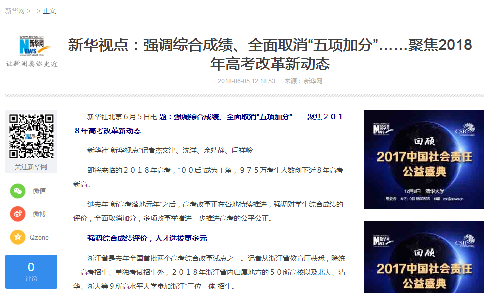 原文標(biāo)題:新華視點:強(qiáng)調(diào)綜合成績、全面取消“五項加分”……聚焦2018年高考改革新動態(tài)