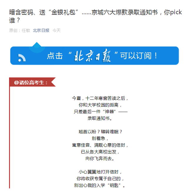 原文標(biāo)題:暗含密碼、送“金銀禮包”......京城六大爆款錄取通知書(shū),你pick誰(shuí)?