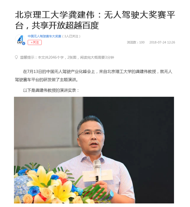 【中國無人駕駛賽車大獎賽】北京理工大學龔建偉:無人駕駛大獎賽平臺,共享開放超越百度