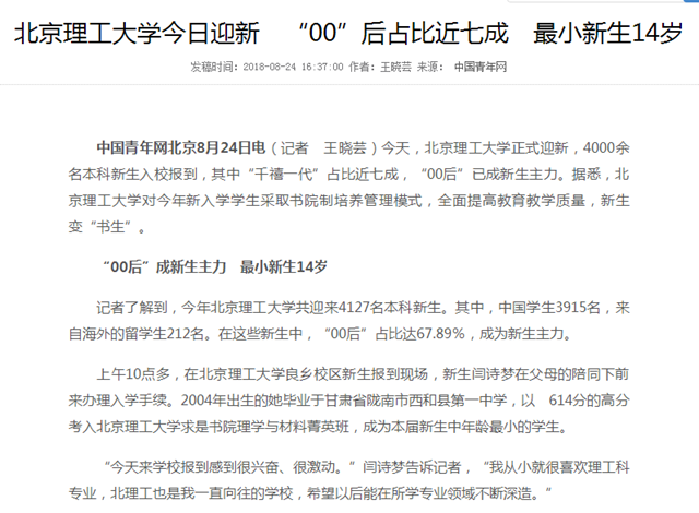 原文標題:北京理工大學今日迎新 “00”后占比近七成 最小新生14歲