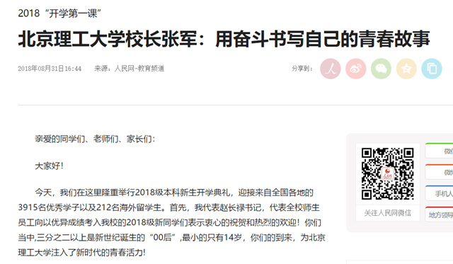 【人民網(wǎng)】北京理工大學(xué)校長張軍:用奮斗書寫自己的青春故事