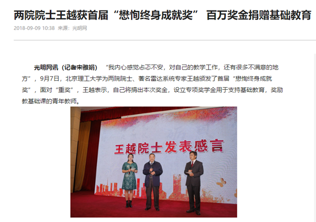 在第34個教師節(jié)到來之際,中國科學(xué)院院士、中國工程院院士、著名雷達(dá)與通迅系統(tǒng)專家王越獲得北京理工大學(xué)今年首次設(shè)立的人才培養(yǎng)工作最高榮譽(yù)“懋恂終身成就獎”。
