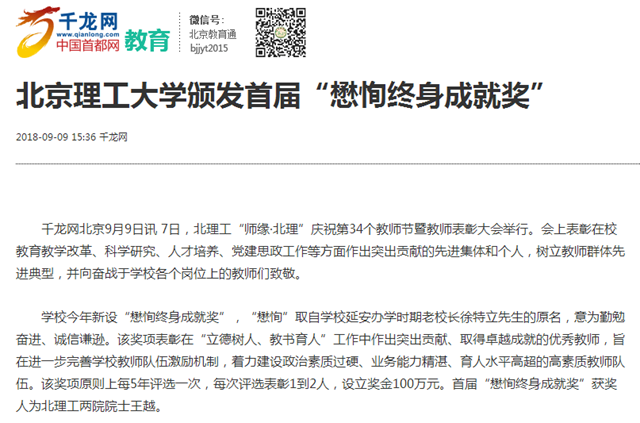 【北青網(wǎng)】北理工為優(yōu)秀教師頒發(fā)首屆100萬“懋恂終身成就獎”