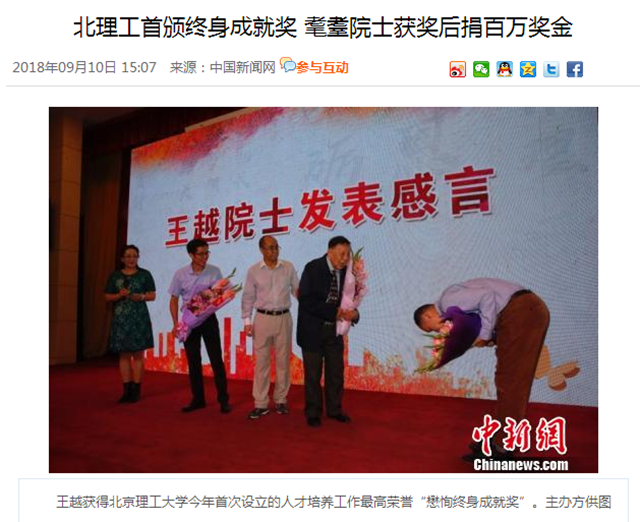 【中國女網(wǎng)】兩院院士王越獲北理工首屆“懋恂終身成就獎” 將捐出獎金支持學(xué)校教育事業(yè)