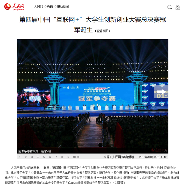 【人民網(wǎng)】第四屆中國“互聯(lián)網(wǎng)+”大學生創(chuàng)新創(chuàng)業(yè)大賽總決賽冠軍誕生