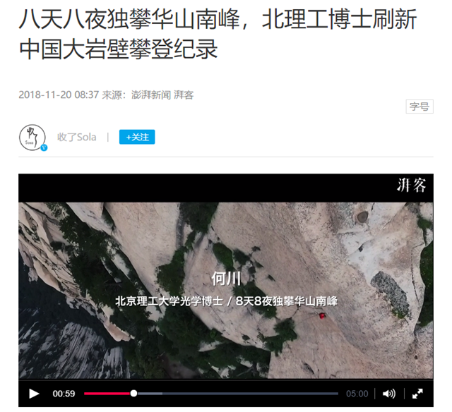 【澎湃新聞】北理工教師何川:刷新中國大巖壁攀登紀(jì)錄