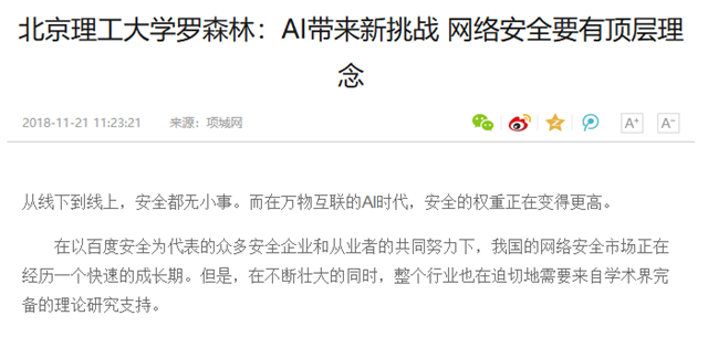 【中國網(wǎng)】北理工羅森林:AI帶來新挑戰(zhàn) 網(wǎng)絡(luò)安全要有頂層理念