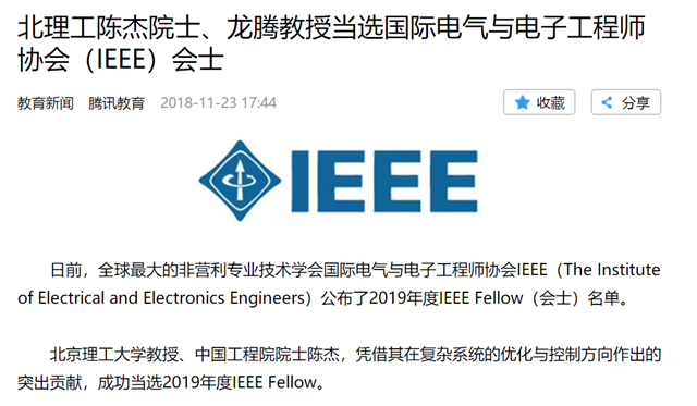 【騰訊網(wǎng)】北理工陳杰院士、龍騰教授當(dāng)選國際電氣與電子工程師協(xié)會(huì)(IEEE)會(huì)士